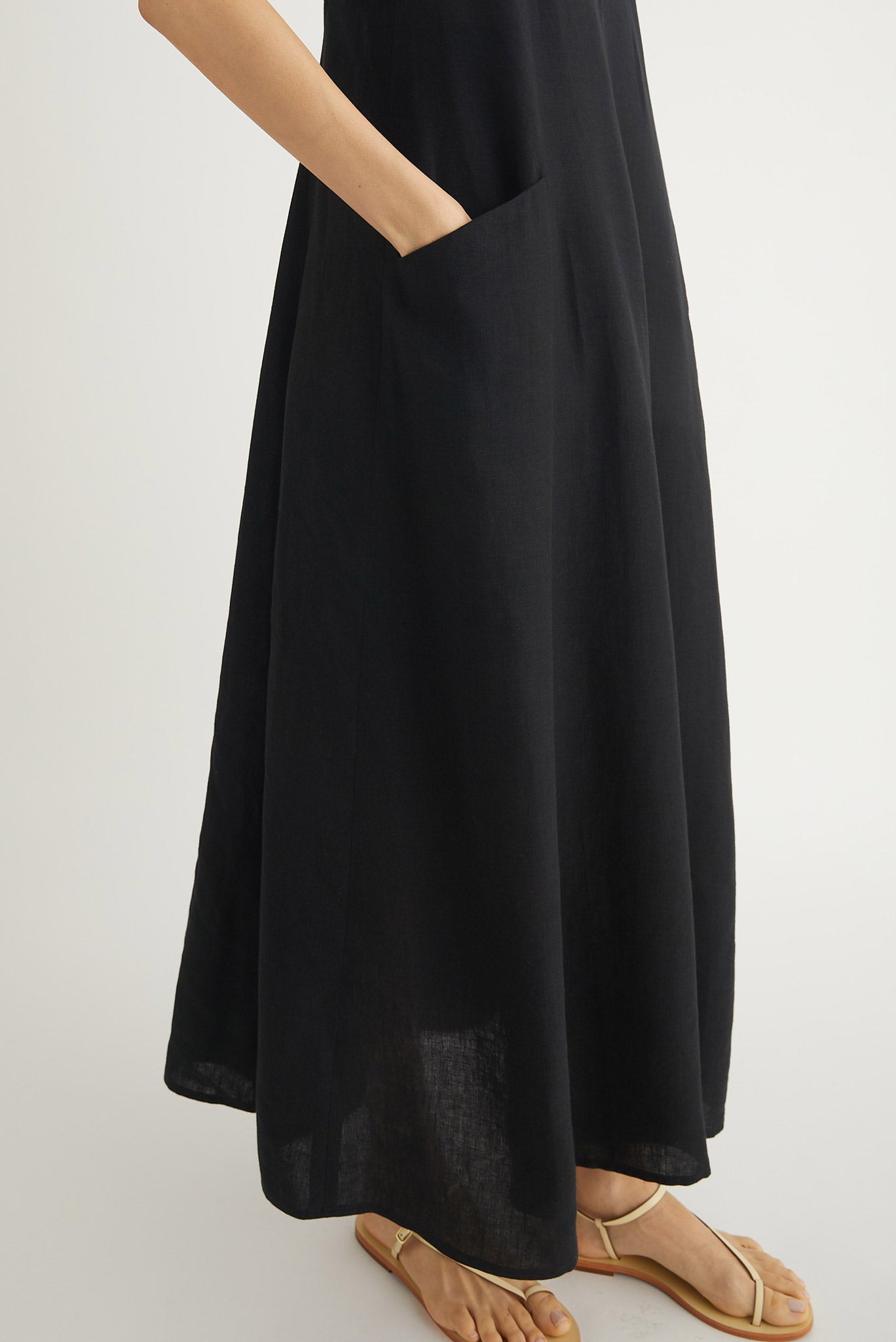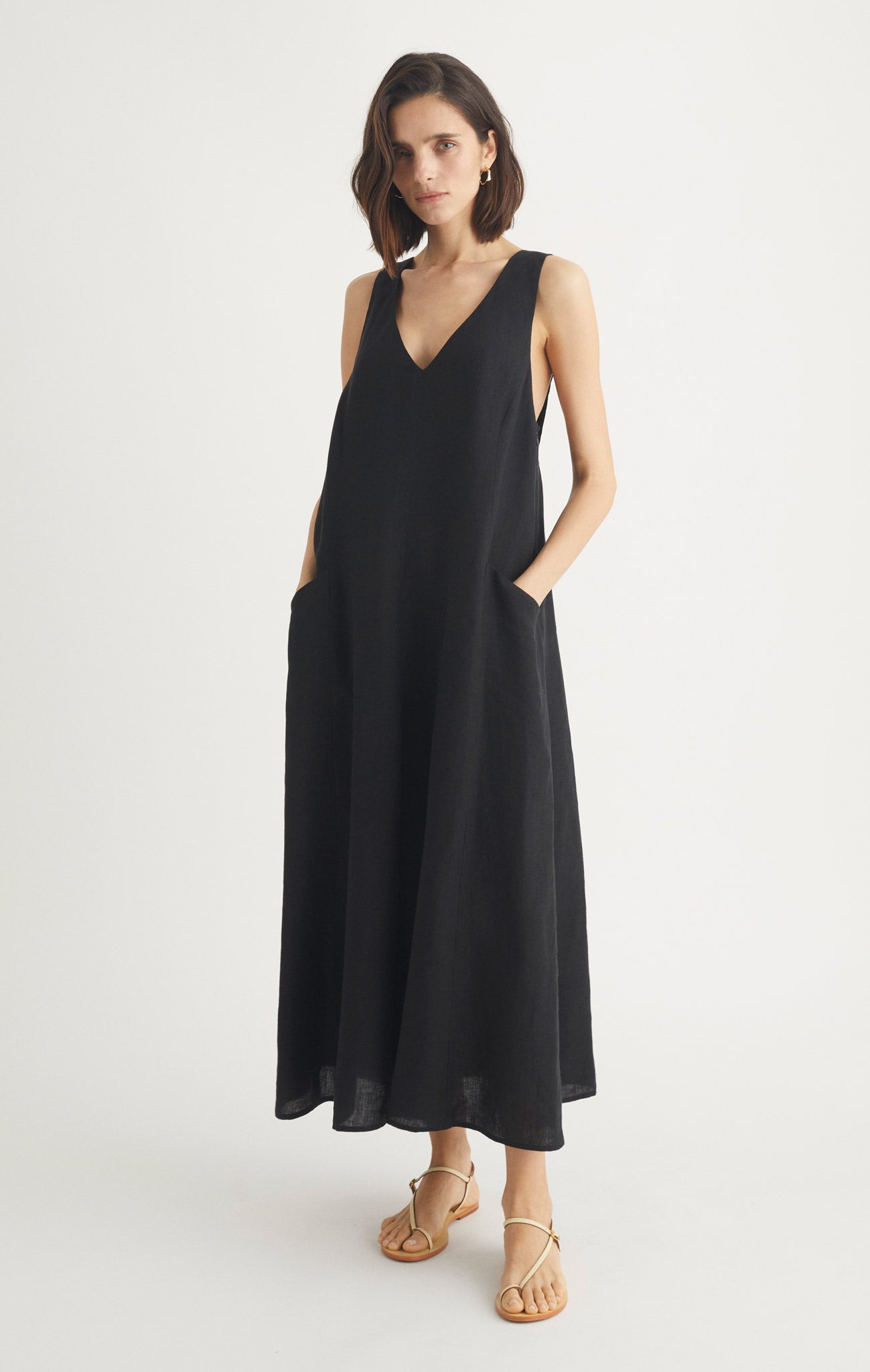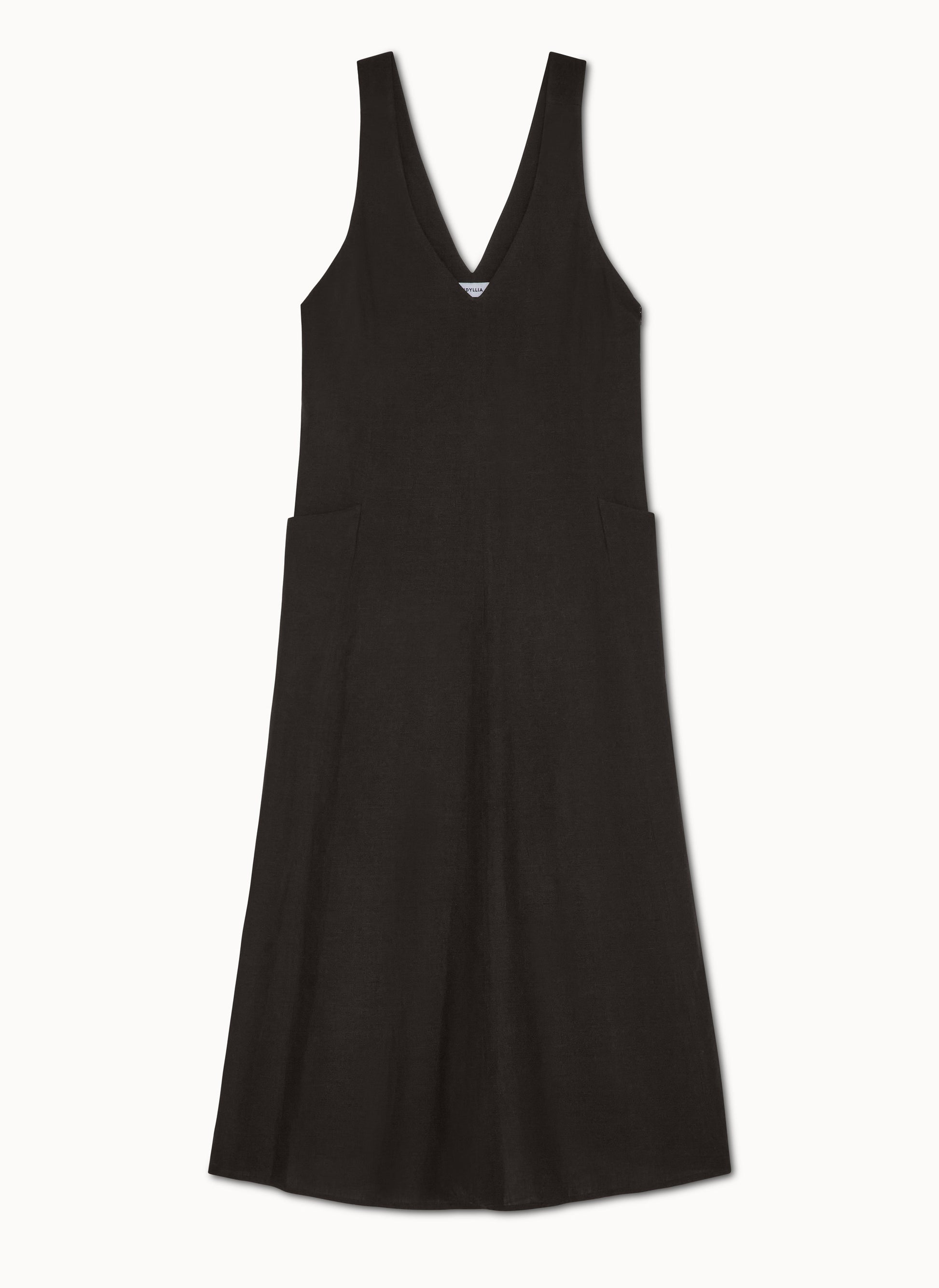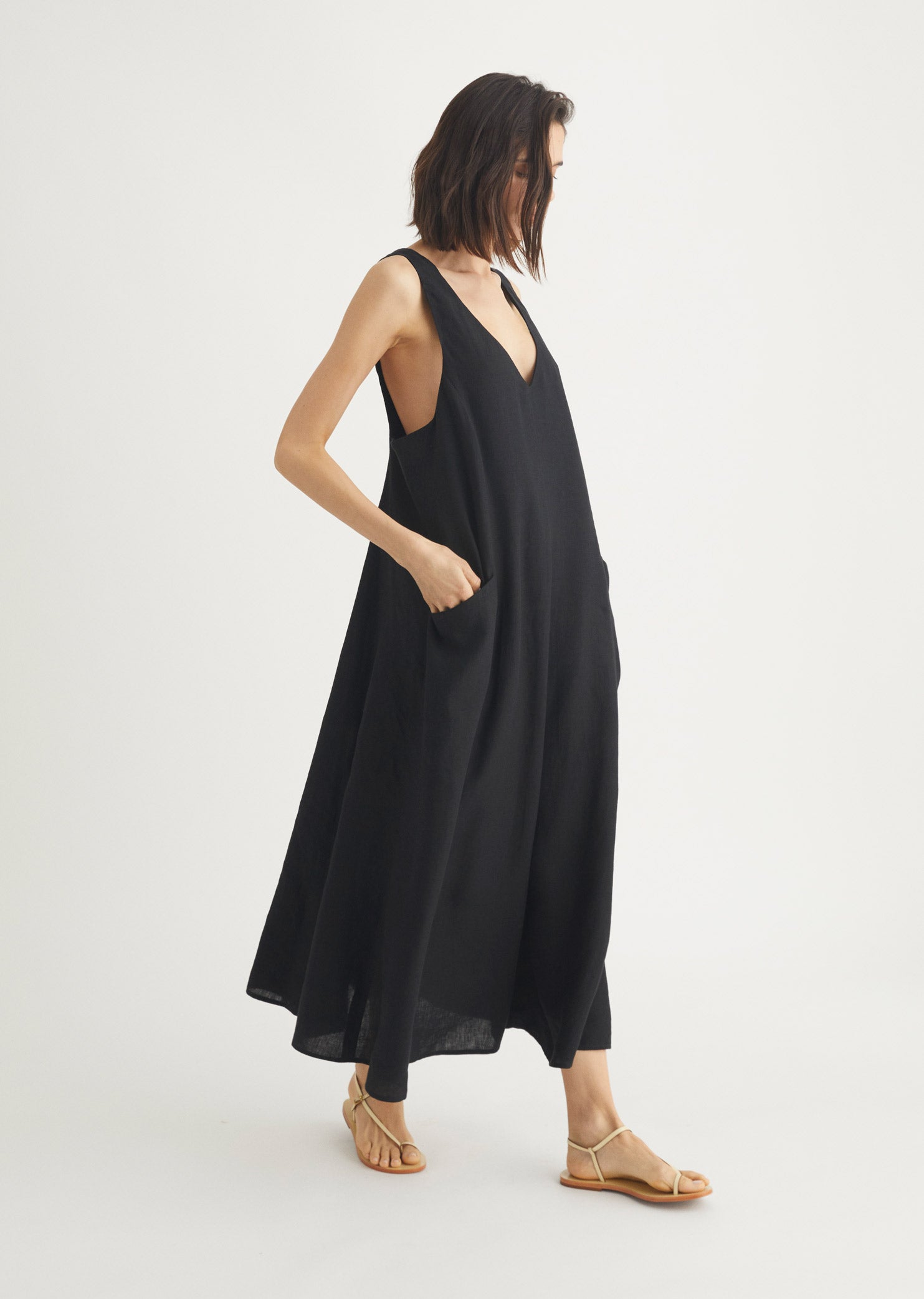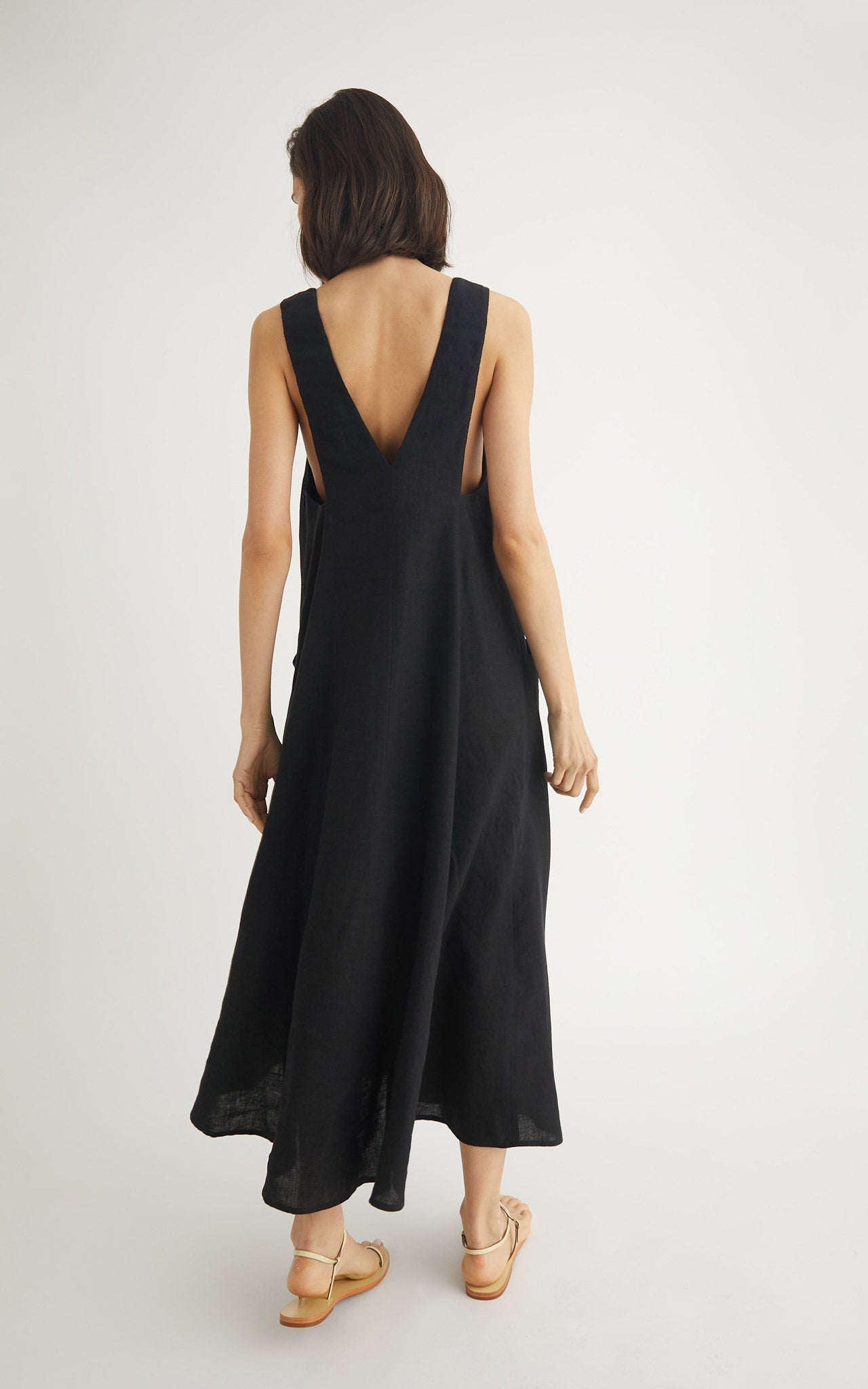 The Clementine is a midi dress cut from breathable, lightweight linen in an airy silhouette. It features a deep V neckline, wide straps to an open back and front pockets at skirt. The linen comes from flax grown and harvested in the Flanders region of Europe, woven in a carbon neutral mill in Belgium, and made with love in LA.