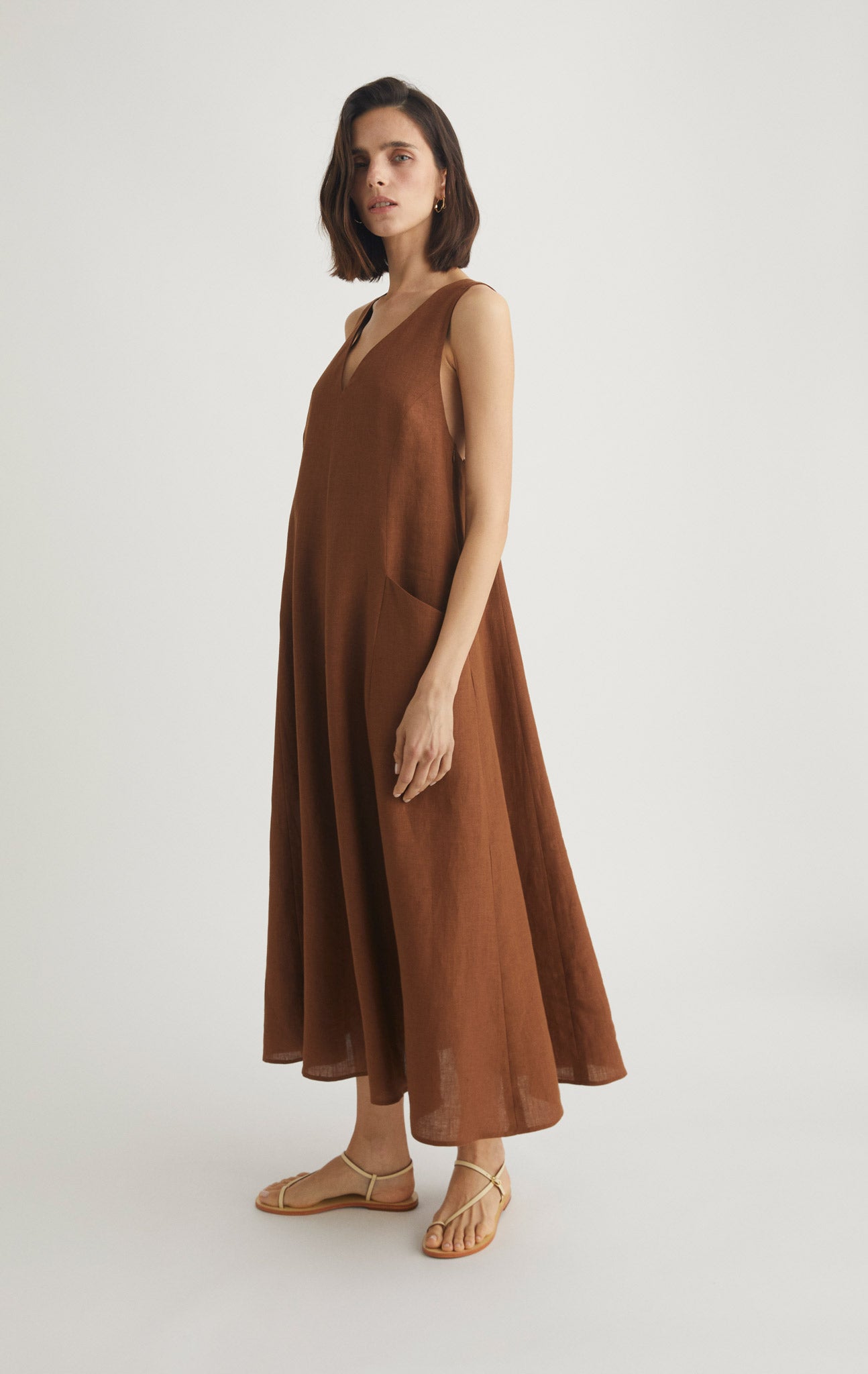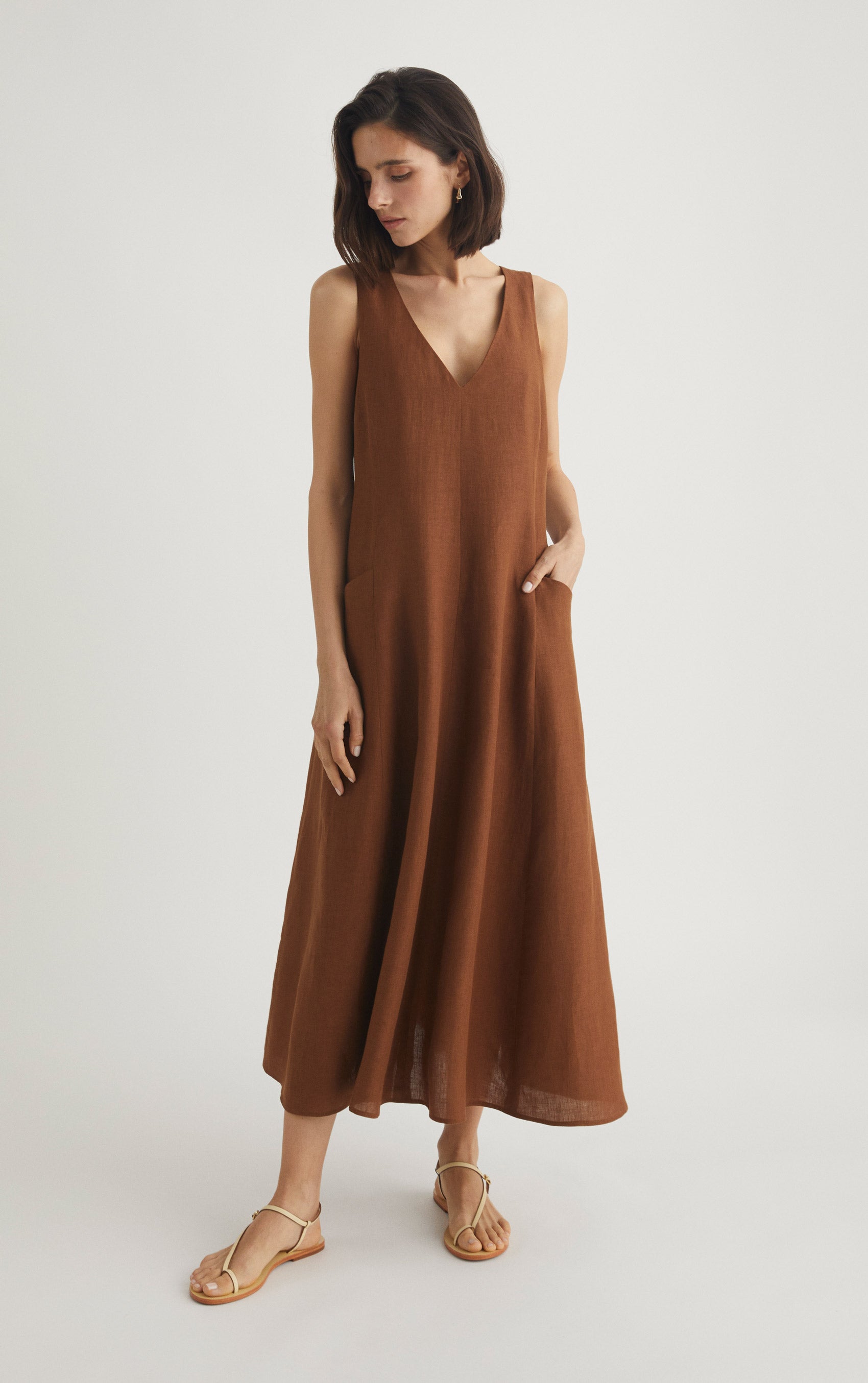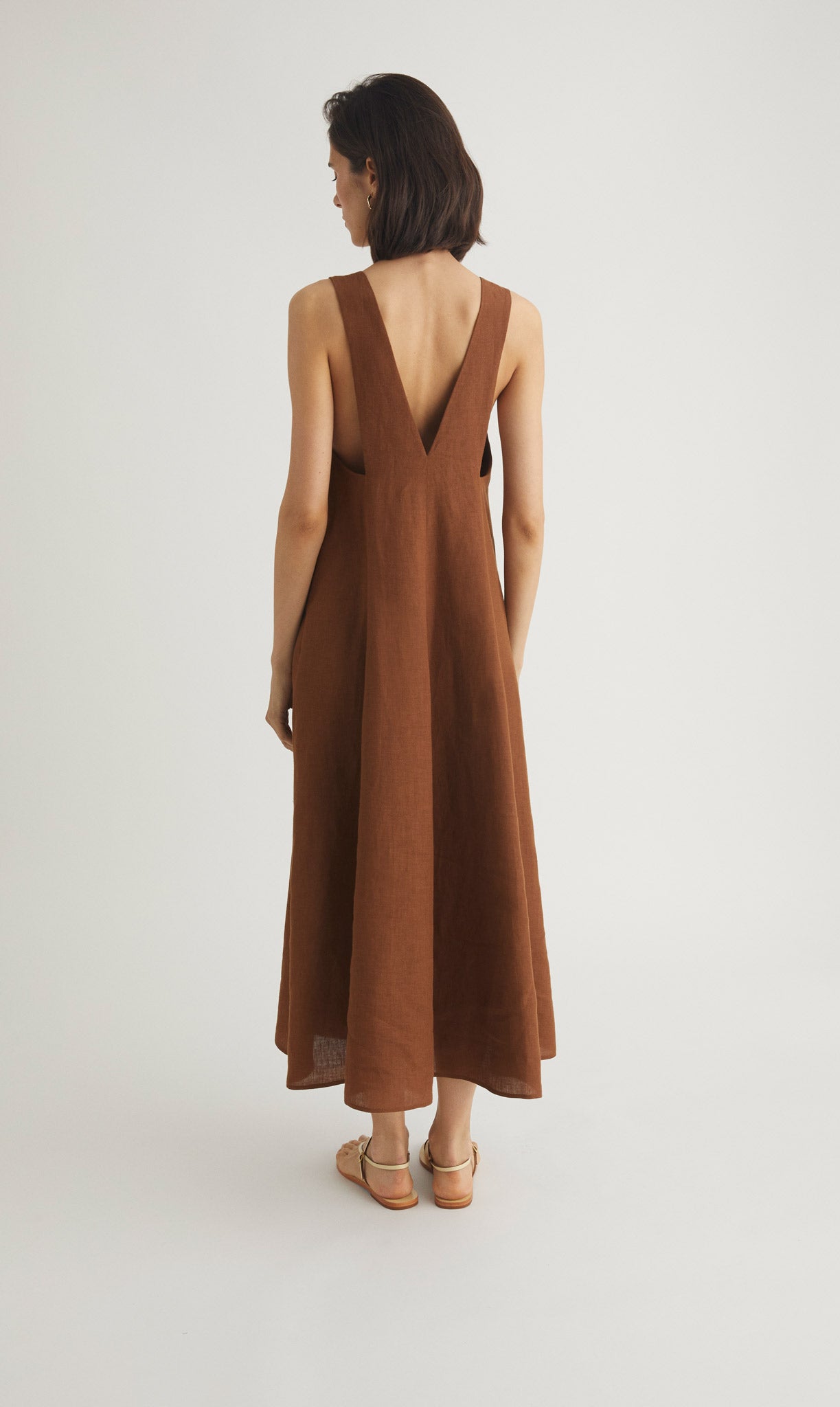 The Clementine is a midi dress cut from breathable, lightweight linen in an airy silhouette. It features a deep V neckline, wide straps to an open back and front pockets at skirt. The linen comes from flax grown and harvested in the Flanders region of Europe, woven in a carbon neutral mill in Belgium, and made with love in LA.