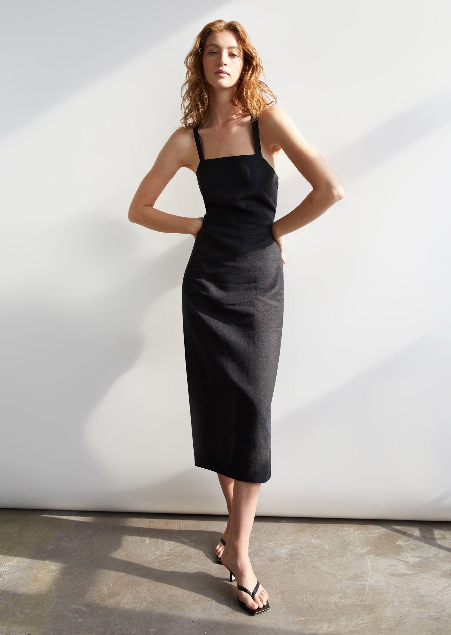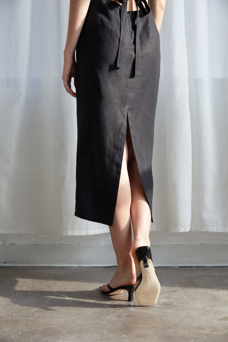 The Luisa is a slim silhouette midi dress with an understated front and dramatic back. This dress features a straight neckline, an open back with lace up ties and a tailored skirt with a high slit . Cut from breathable, medium weight linen- Grown and harvested in the Flanders region of Europe, woven in Belgium from a carbon neutral mill and made with love in NYC.