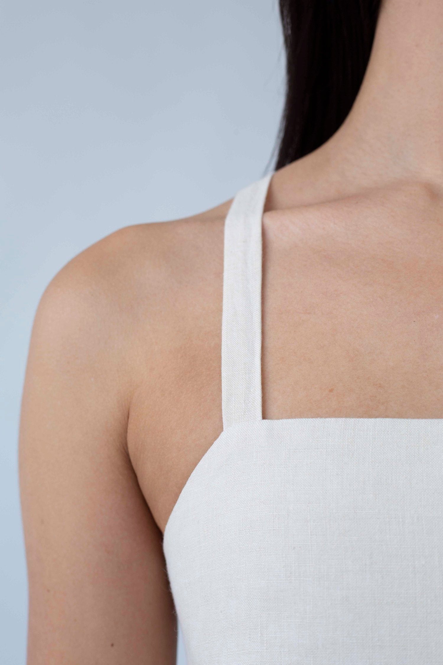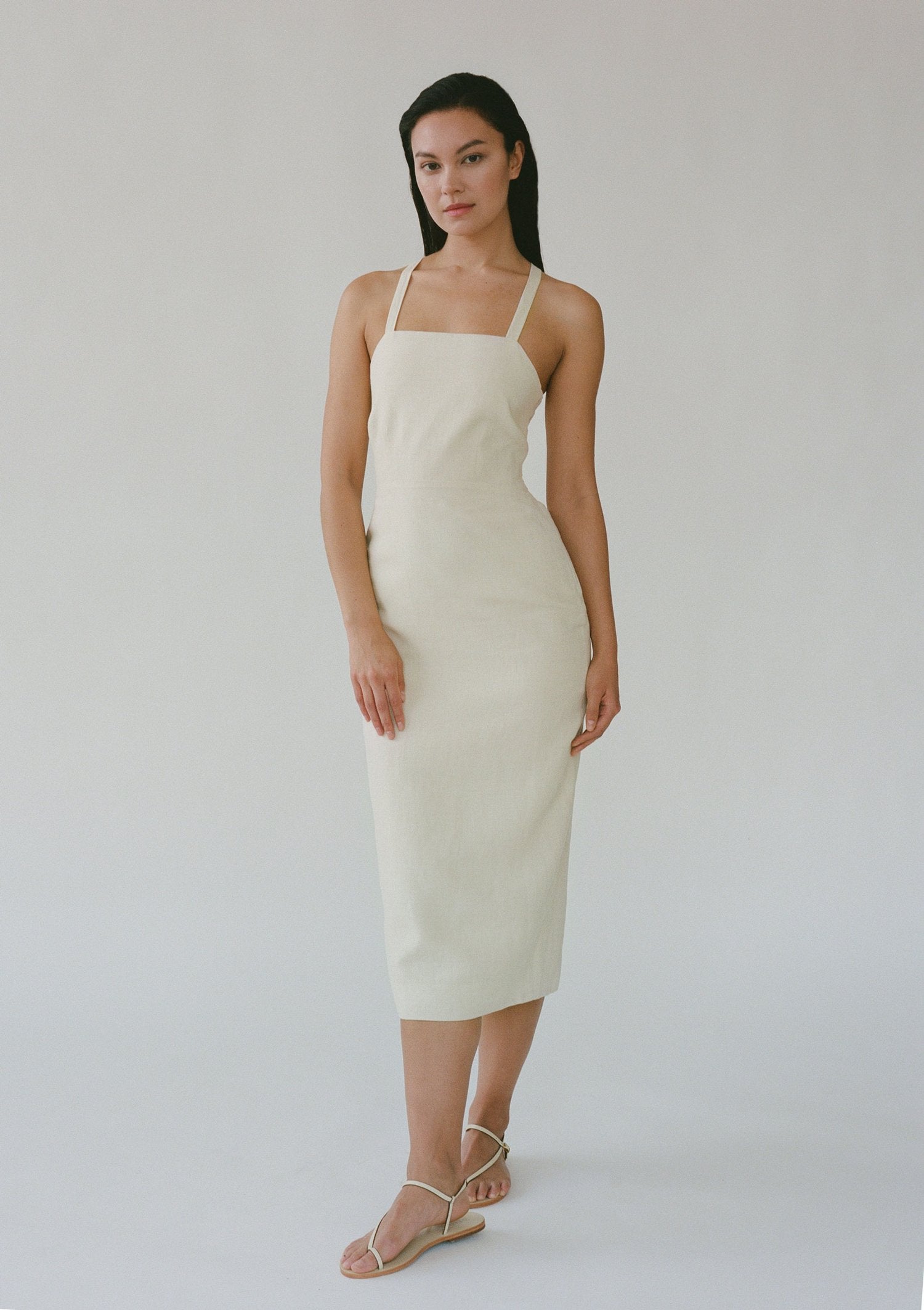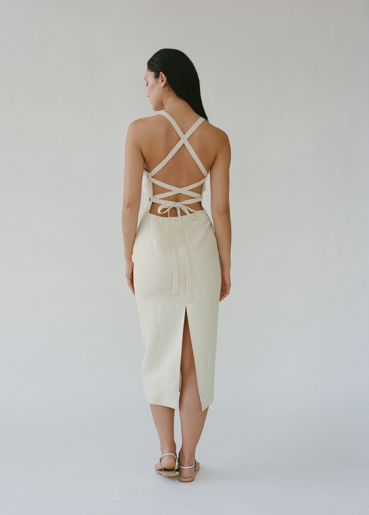 The Luisa is a slim silhouette midi dress with an understated front and dramatic back. This dress features a straight neckline, an open back with lace up ties and a tailored skirt with a high slit . Cut from breathable, medium weight linen- Grown and harvested in the Flanders region of Europe, woven in Belgium from a carbon neutral mill and made with love in NYC.
