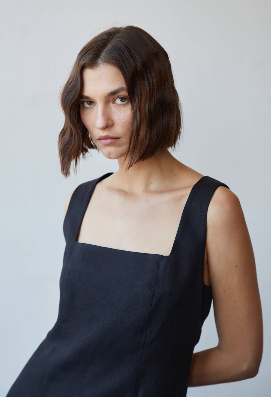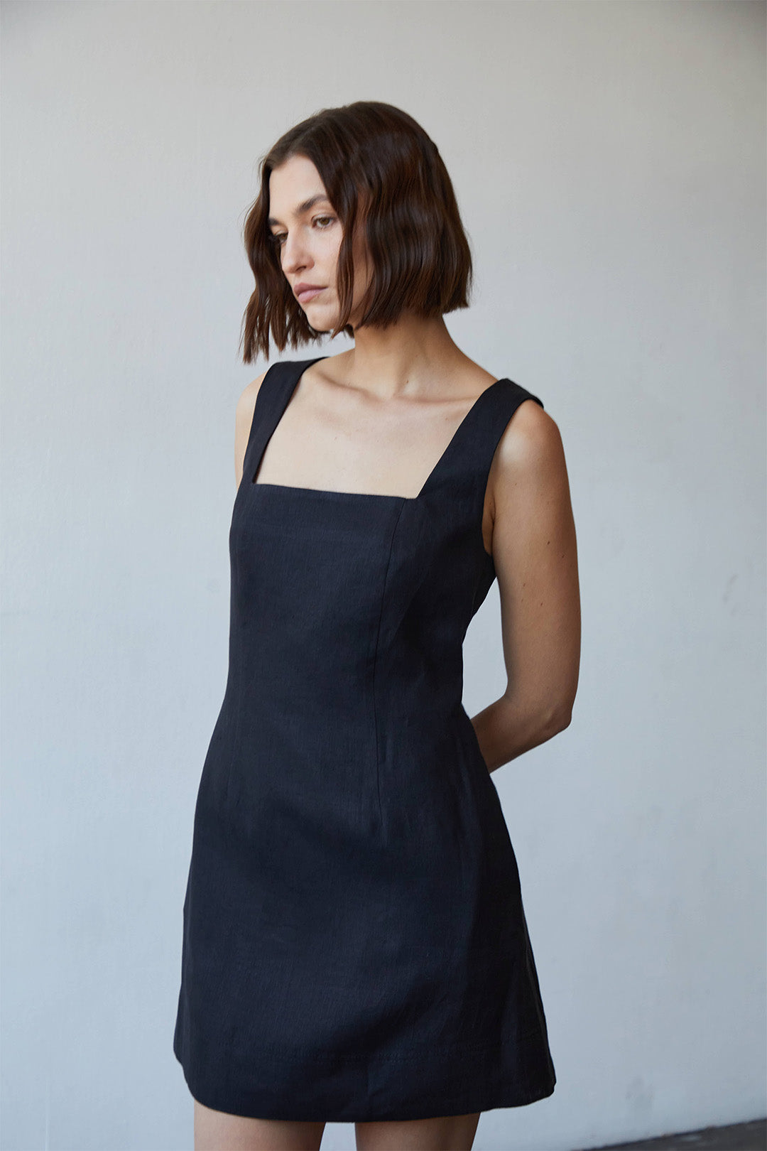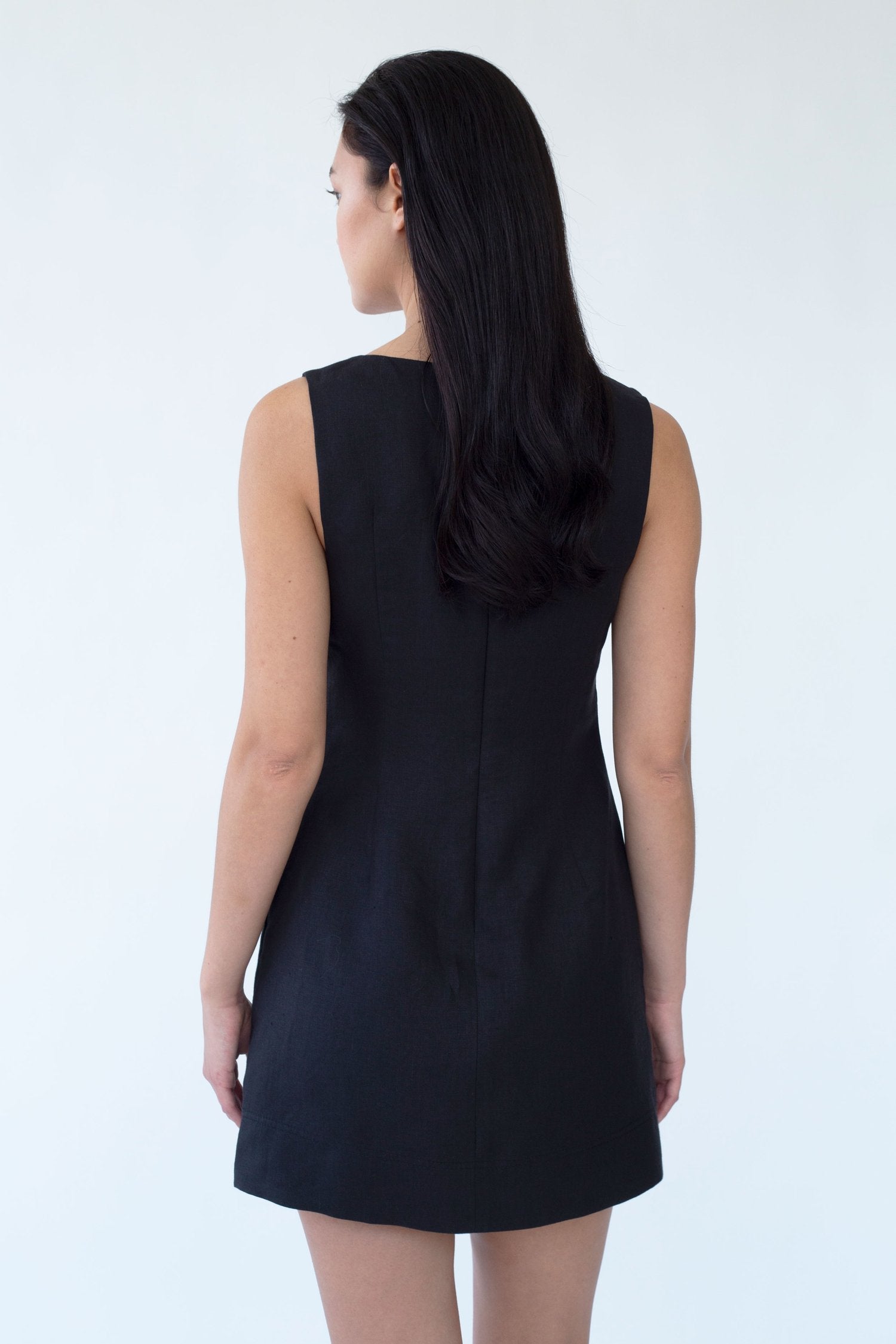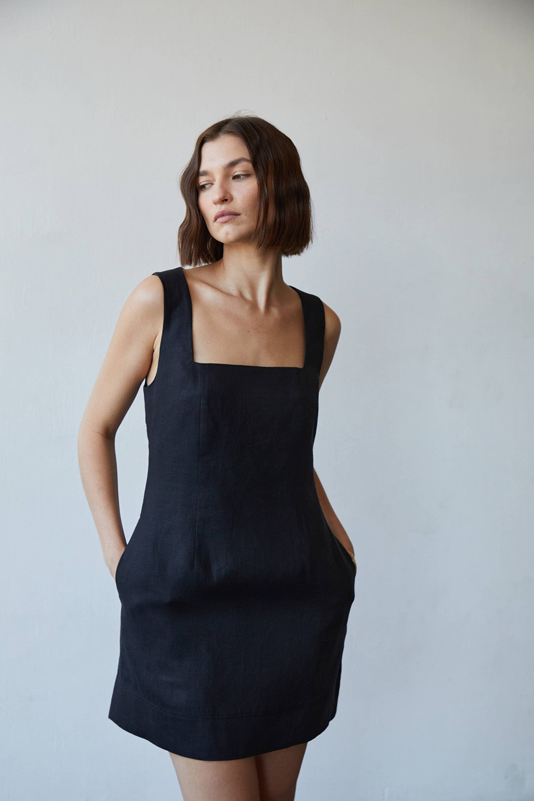 The Olivia is a mini length dress with a low square neckline, fitted waist and A-line skirt. This dress features wide straps, wide hem with stitching detail and side pockets. Cut from a medium weight linen- Grown and harvested in the Flanders region of Europe, woven in Belgium from a carbon neutral mill and made with love in LA.