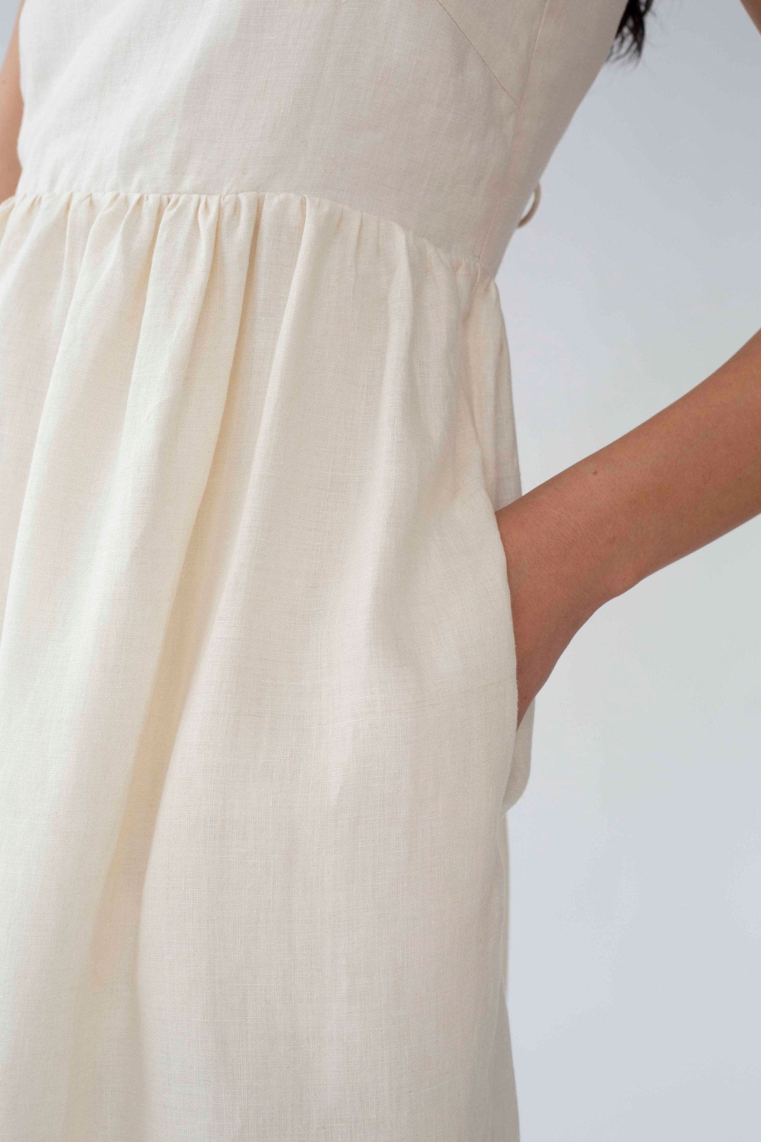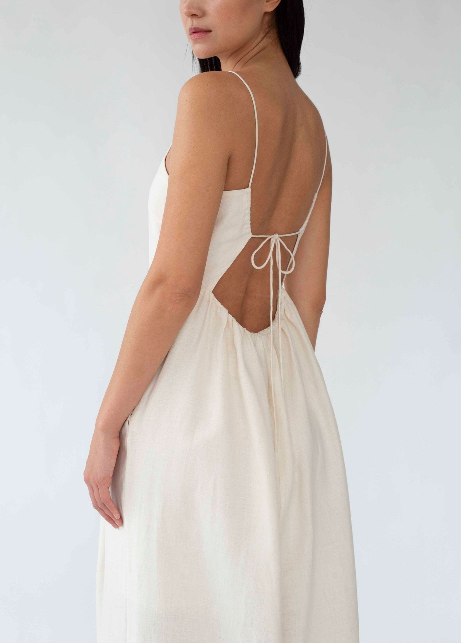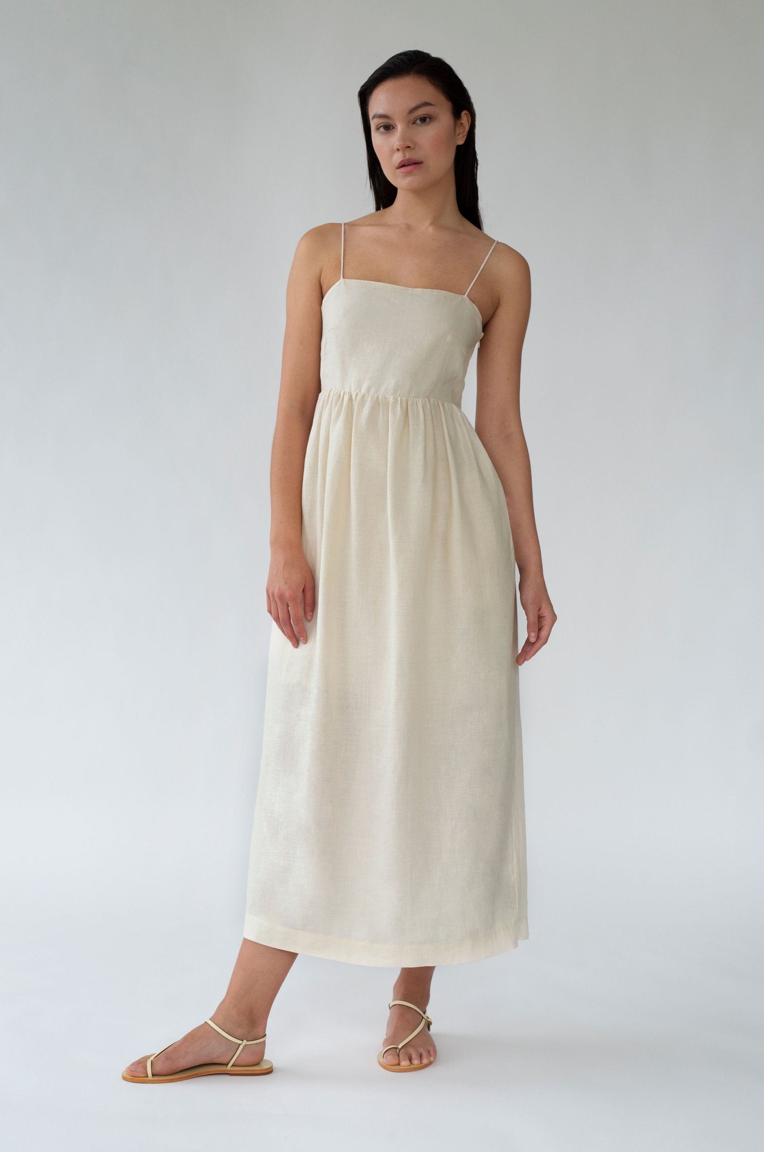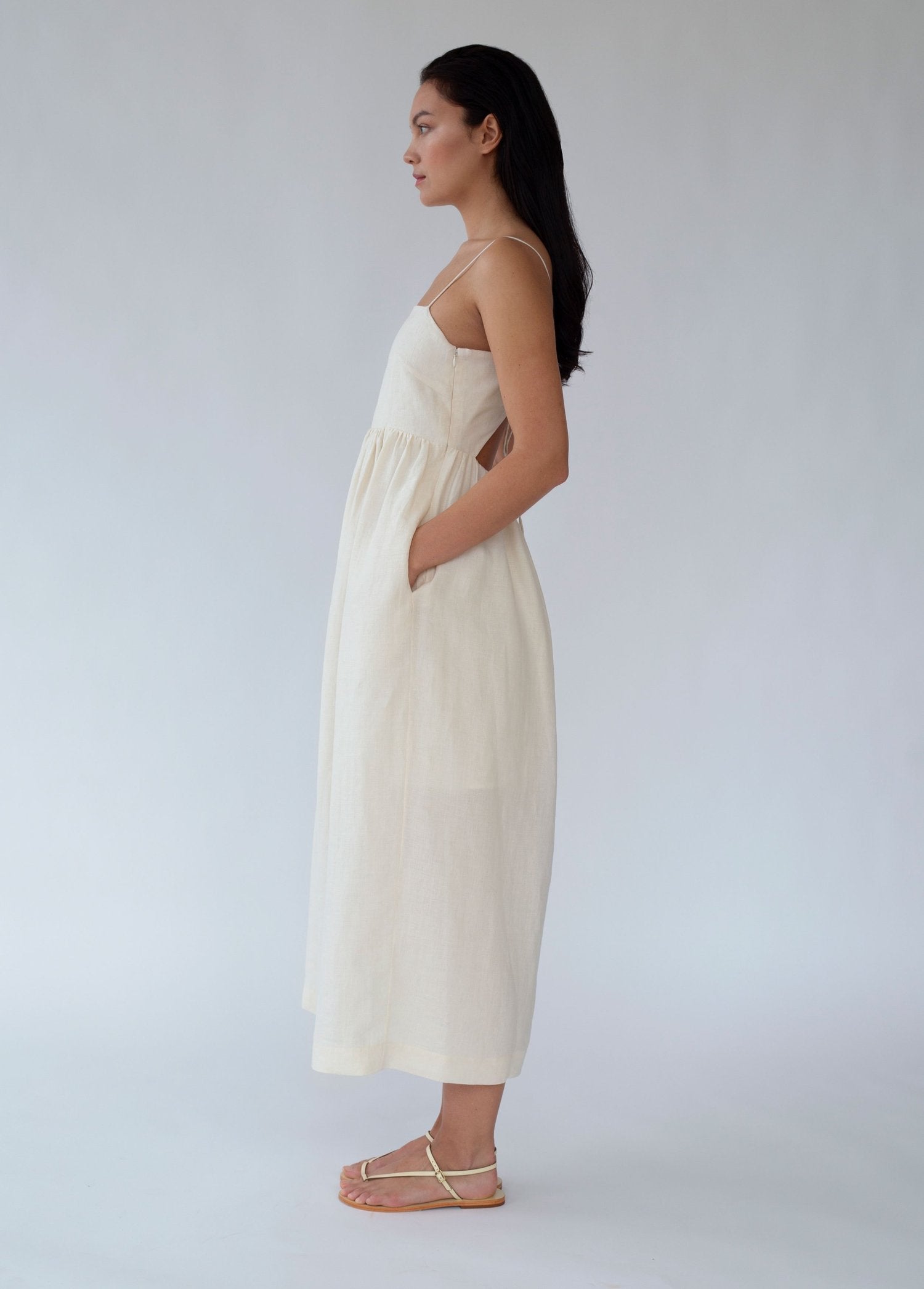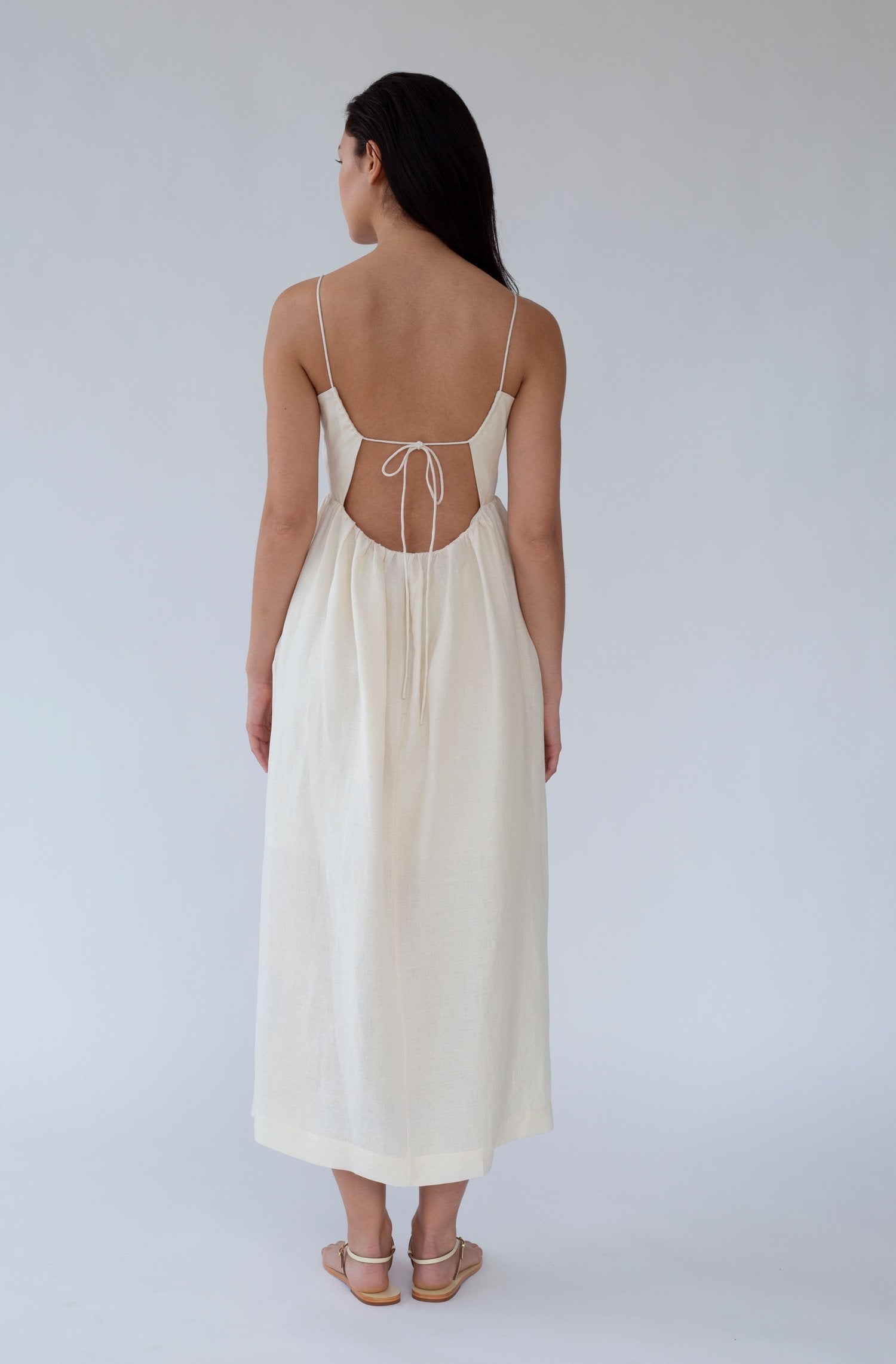 The Sophie is a midi length dress with a square neckline, high waist and a gathered skirt with pockets. This dress features an open back and delicate, adjustable straps that can be positioned straight or crossed for an adjusted fit. Cut from breathable, lightweight linen- Grown and harvested in the Flanders region of Europe, woven in Belgium from a carbon neutral mill and made with love in NYC.