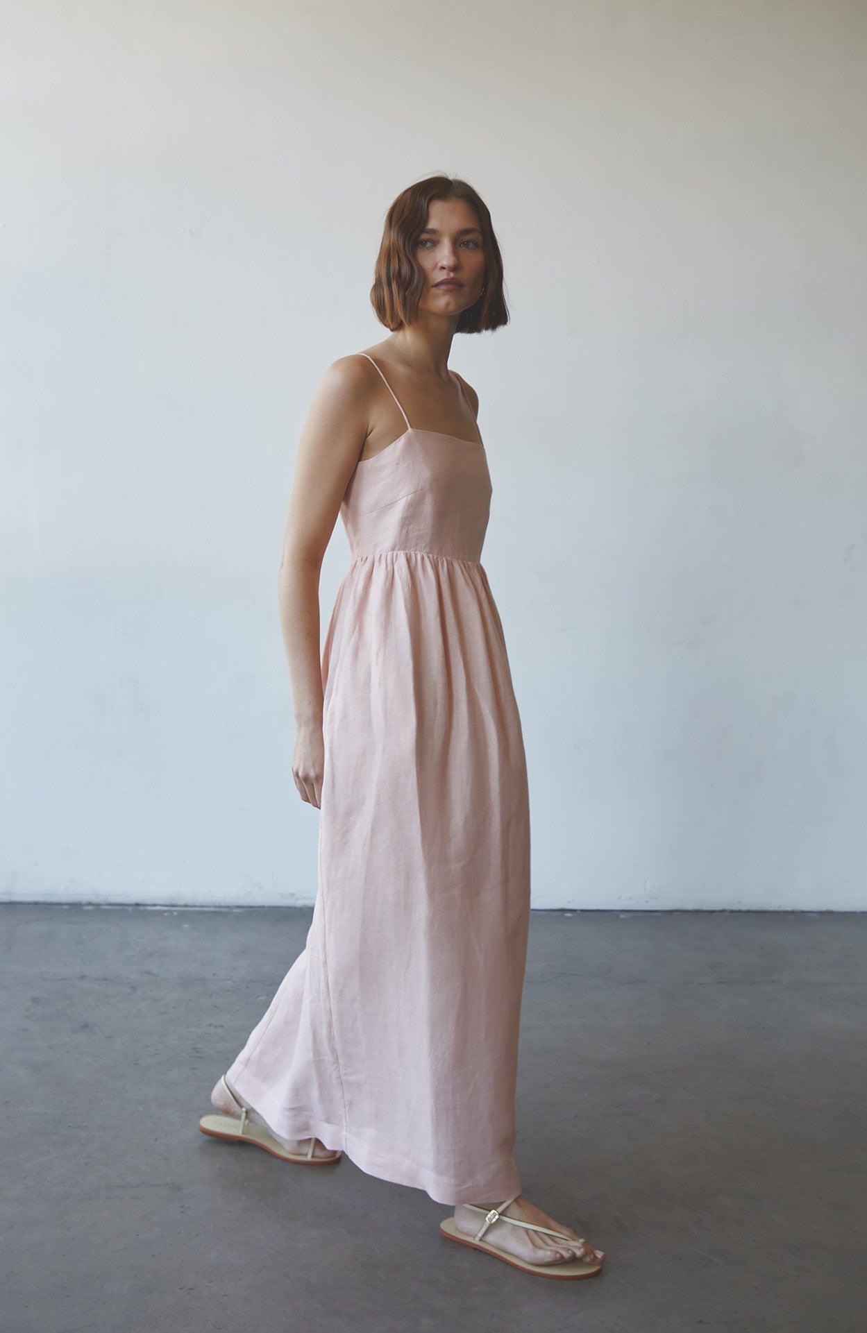 The Sophie is a midi length dress with a square neckline, high waist and a gathered skirt with pockets. This dress features an open back and delicate, adjustable straps that can be positioned straight or crossed for an adjusted fit. Cut from breathable, lightweight linen- Grown and harvested in the Flanders region of Europe, woven in Belgium from a carbon neutral mill and made with love in NYC.